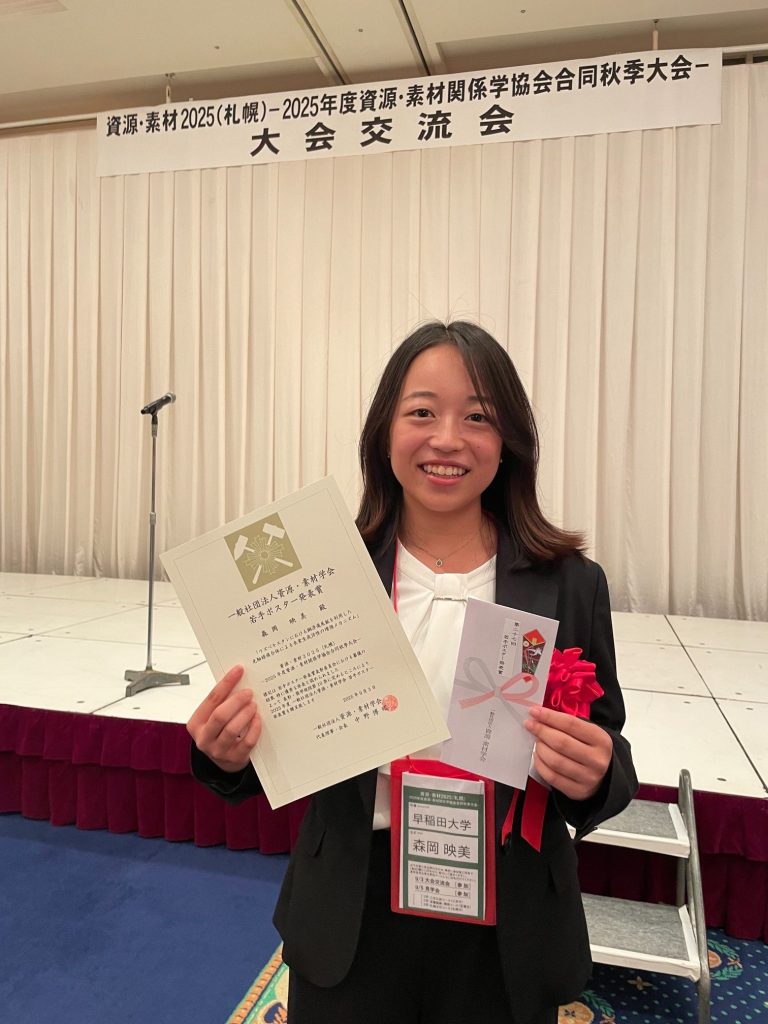 学部4年 森岡映美さんが若手ポスター発表賞を受賞しました! 2025-09-03 最終更新日時 : 2025-10-30 admin 2025年9月3日 資源・素材学会秋季大会(札幌)にて、B4の森岡映美さんが 「ウズベキスタンにおける銅精錬尾鉱との光触媒による水素生成活性の増強メカニズム」にて"若手ポスター発表賞" を受賞しました。