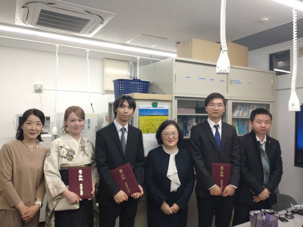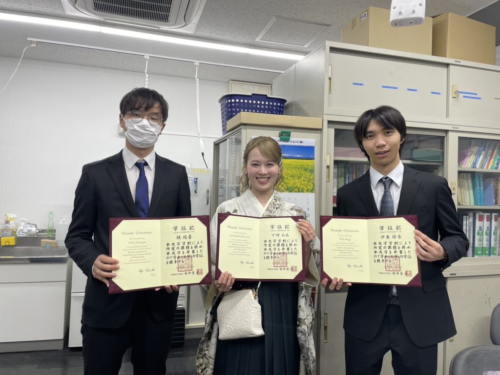 笹木研究室より3名が卒業いたしました( 顔超雲:大学院進学/下村みあ:公務員志望/伊藤将吾:三菱マテリアル㈱ )